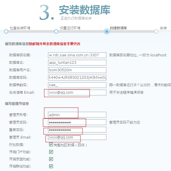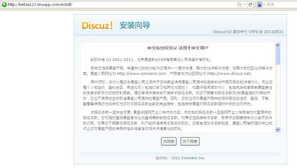 3 Discuz!X安装 3.1安装 访问安装链接//appname.sinaapp.com/install/ ,把appname改成你应用二级域名的前缀。我刚才建的是luntan123,所以接着输入