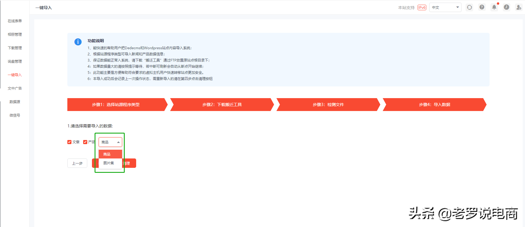 1.4 选择导入的内容(产品或文章);